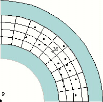 Figure 11 Polar grid between frosted grips with the origin of polar grid at point P. The grid origin was at the rotation centre of the upper glass slide and a second marker point (M) in the annular shear zone was chosen to fix a second reference axis |
