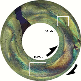 Photomicrographic under crossed nicols of the entire annular shear zone at beginning of deformation. The location of movies 2 and 3 is shown.