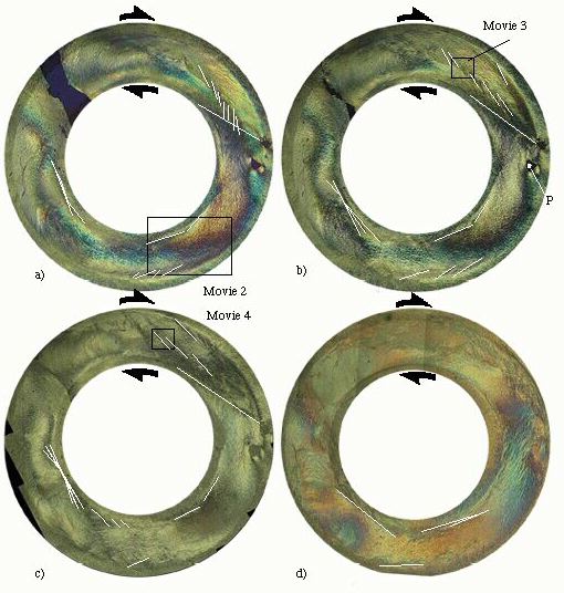 Figure 8 Photomicrographic under crossed nicols of the entire annular shear zone at different finite strains. The place of the movie 2, 3 and 4 are signed.Figure a-d show the development of microstructurs in the entire sample. The finite strain was outer shear zone boundary at a 1.3, at b 6.0 at c 8.4 and at d 18.3. The white lines indicate some shear bands (c') and thrust in the experiment. All four pictures were rotated relative to the fix point P. |